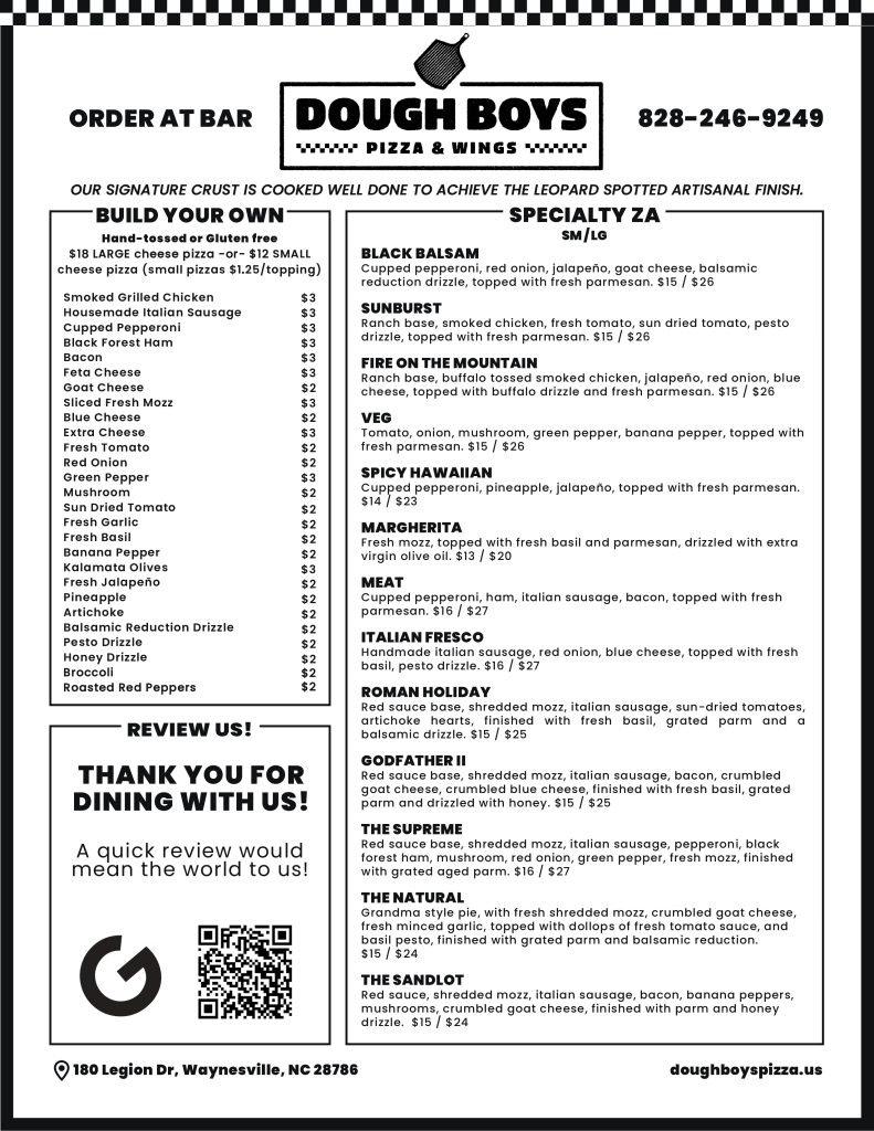 EXCELLENT Based on 800 reviews Posted on Jim McNabTrustindex verifies that the original source of the review is Google. Finally! I’ve been searching for really good pizza near Cherokee and I’d tried a few places between there and Waynesville and not really found it yet. Until now. Doughboys is a great space to grab a pie and drink. The building inside is super casual and kind of industrial cool with the vibe. I ordered a small Supreme to go and the online ordering was easy as pie 🍕 and the food was great! Lots of fresh toppings, great red sauce for the base and quality cheese make for a great pie. It was so good, I’m going back tonight.Posted on Jacob McCrackenTrustindex verifies that the original source of the review is Google. One of our favorite date night placesPosted on Elisabeth GonneringTrustindex verifies that the original source of the review is Google. Great food to share with friends. Good price. Fast service.Posted on emily cabeTrustindex verifies that the original source of the review is Google. Great pizza and great value!Posted on Deena MerkleTrustindex verifies that the original source of the review is Google. Placed my to go order and even though it was busy they were still able to accommodate us with ease. Great customer service!Posted on Fred P.Trustindex verifies that the original source of the review is Google. Good service and excellent pizza & wings! A larger space would be a great benefit 👍🏾Posted on Hunter HallTrustindex verifies that the original source of the review is Google. Once I found this pizza joint. There is no other option for pizza in Waynesville. The wings, pizza, salads, apps, and beer selection are all off the charts. Recommend this place to everyone who is in the area!Posted on don koehlerTrustindex verifies that the original source of the review is Google. Best pizza ever